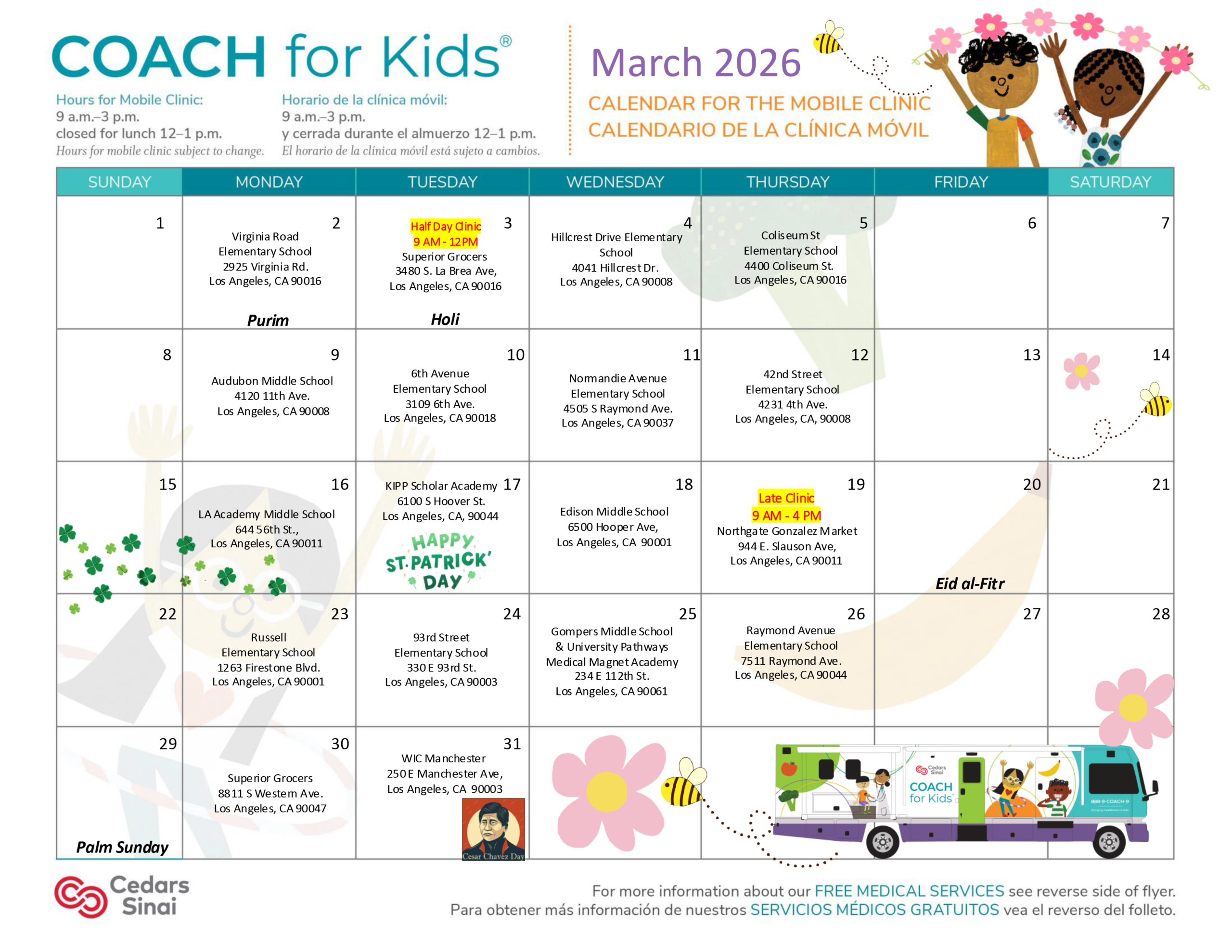 Cedars-Sinai COACH (Asistencia de extensión comunitaria para la salud infantil) para niños es una clínica médica móvil comprometida a abordar las necesidades médicas de familias de bajos ingresos, incluidas aquellas que se encuentran sin hogar o sin documentación, con niños menores de 18 años. COACH for Kids ofrece servicios médicos de transición gratuitos, apoyo social, acceso a recursos comunitarios y visitas integrales de atención infantil. Estas visitas se centran en exámenes físicos, atención preventiva, evaluaciones de crecimiento y desarrollo, exámenes de audición y visión, pruebas de laboratorio y exámenes de detección de tuberculosis. COACH for Kids presta servicios a comunidades en todo el sur de Los Angeles, operando en escuelas, lugares de culto, complejos de viviendas públicas, oficinas de WIC, centros Head Start y otras organizaciones comunitarias.